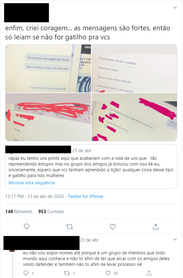 Ainda de acordo com a vítima, os fatos vieram à tona após a namorada de um dos integrantes do grupo publicar toda a conversa dos estudantes no Twitter.
