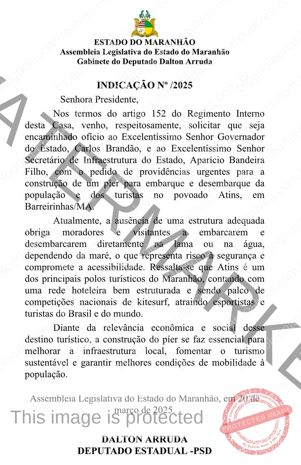 Durante a sua passagem como deputado estadual, o advogado Dalton Arruda apresentou diversas propostas para desenvolver o Maranhão, dentre elas, uma ganhou destaque nesta segunda-feira, 19 de agosto, e evidencia o papel visionário do parlamentar na investidura do cargo. No dia 20 de março desse ano, foi apresentada a Indicação nº 371/2025, solicitando ao Governo do Maranhão, a construção de um píer para embarque e desembarque de moradores e turistas no povoado Atins, em Barreirinhas e em entrevista a Tv Mirante, o governador Carlos Brandão confirmou a realização da obra.