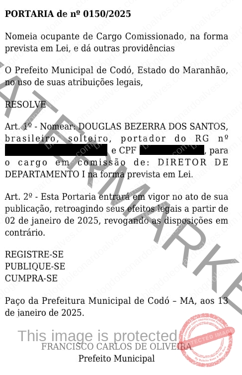 Douglas Bezerra dos Santos foi nomeado para o cargo de Diretor de Departamento I em 13 de janeiro de 2025, ou seja, quatro meses antes da criação da própria empresa e pouco tempo antes da contratação pelo Legislativo Municipal.