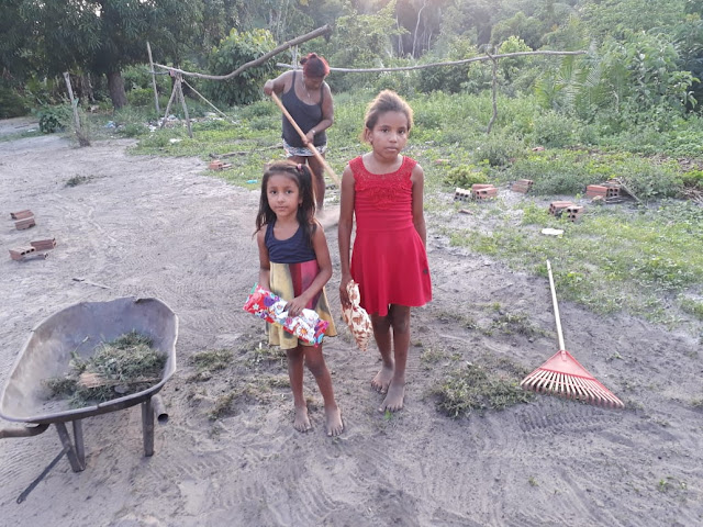 | Irmãs que ajudavam a mãe na limpeza à frente de sua casa, pararam para receber seus brinquedos |