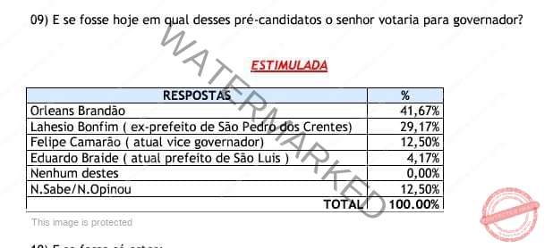 Para o Senado, em cenário estimulado, a pesquisa aponta o governador Carlos Brandão (PSB) como o preferido, somando 54,17% das intenções de voto. Na sequência, vem o senador Weverton Rocha (PDT), com 20,83% e o ministro dos Esportes, André Fufuca (PP), com 12,50%. Ainda de acordo com a pesquisa para o cargo de senador, 8,33% não souberam ou não opinaram e 4,17% disseram não votar em nenhum dos candidatos apresentados.
