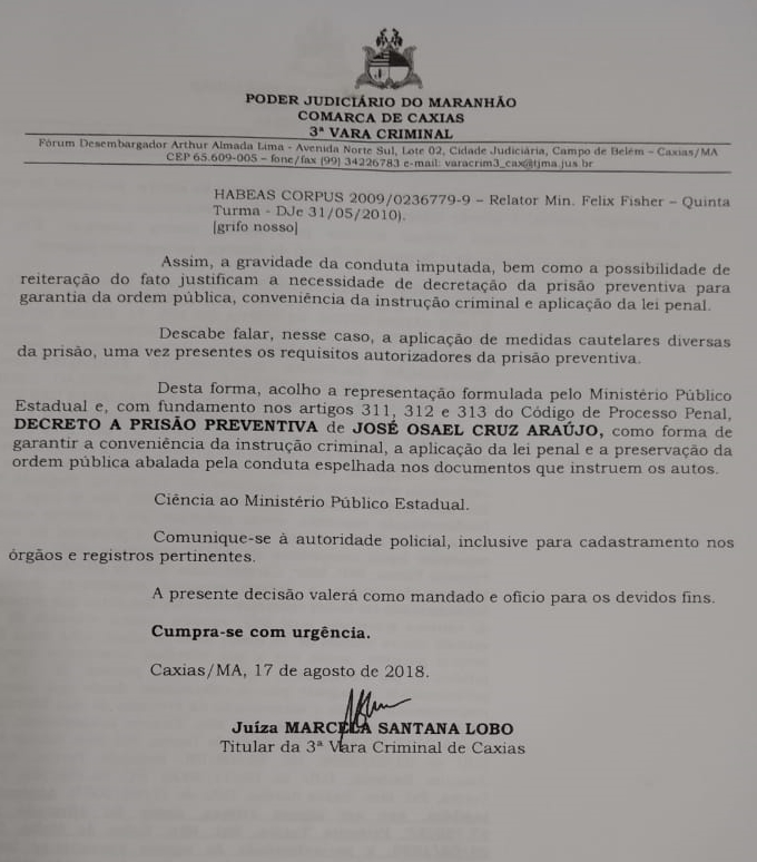 O mandado de prisão preventiva foi expedido pela juíza da 3ª Vara Criminal de Caxias, Marcela Santana Lobo, em atendimento a representação da Polícia Civil.