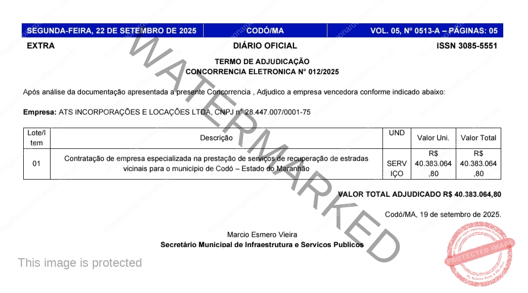 O valor total adjudicado chama atenção: R$ 40.383.064,80. A publicação foi assinada por Márcio Esmero Vieira, Secretário Municipal de Infraestrutura e Serviços Públicos, no dia 19 de setembro de 2025.